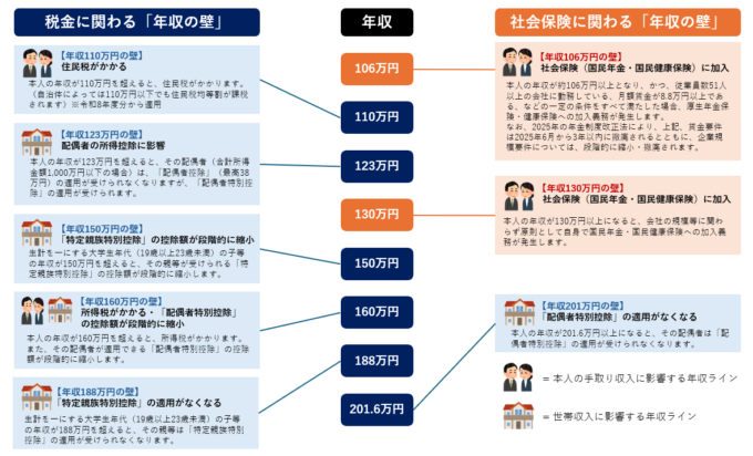 下図は、そのうち2つ「税金に関わる壁」と「社会保険に関わる壁」を分かりやすく区分したものです。