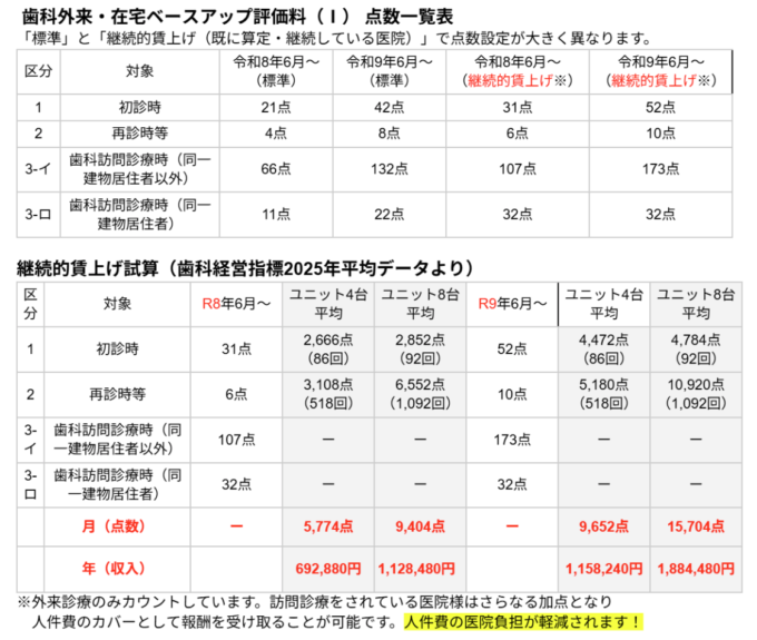 参考までに、点数一覧と、ユニット4台平均、ユニット8台平均の外来診療の点数を試算しました。